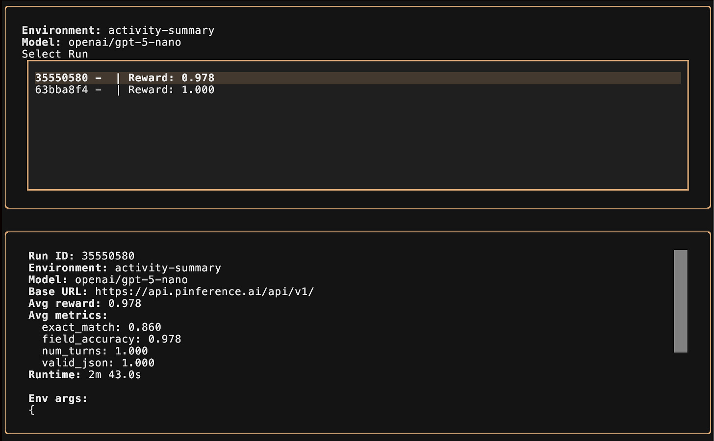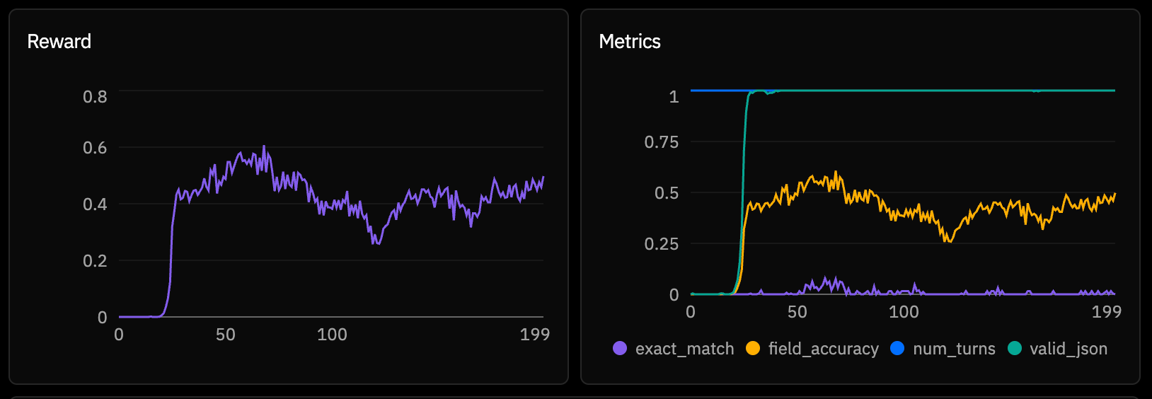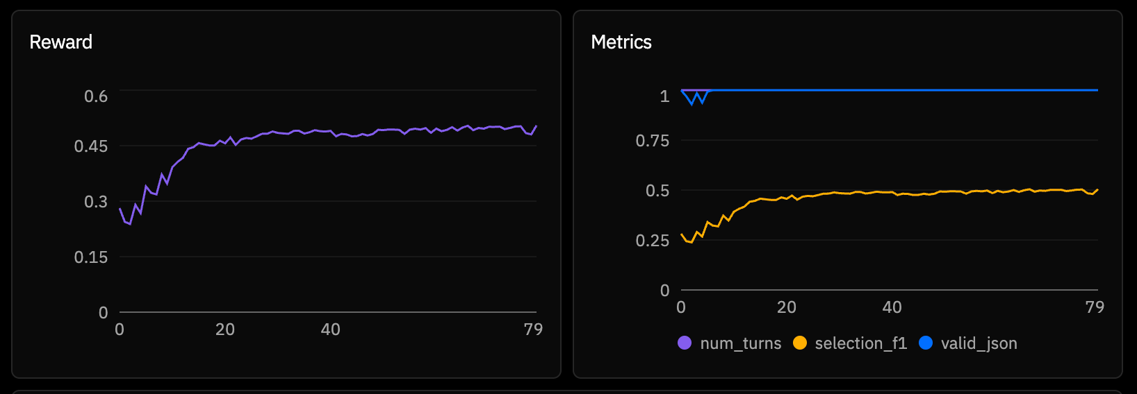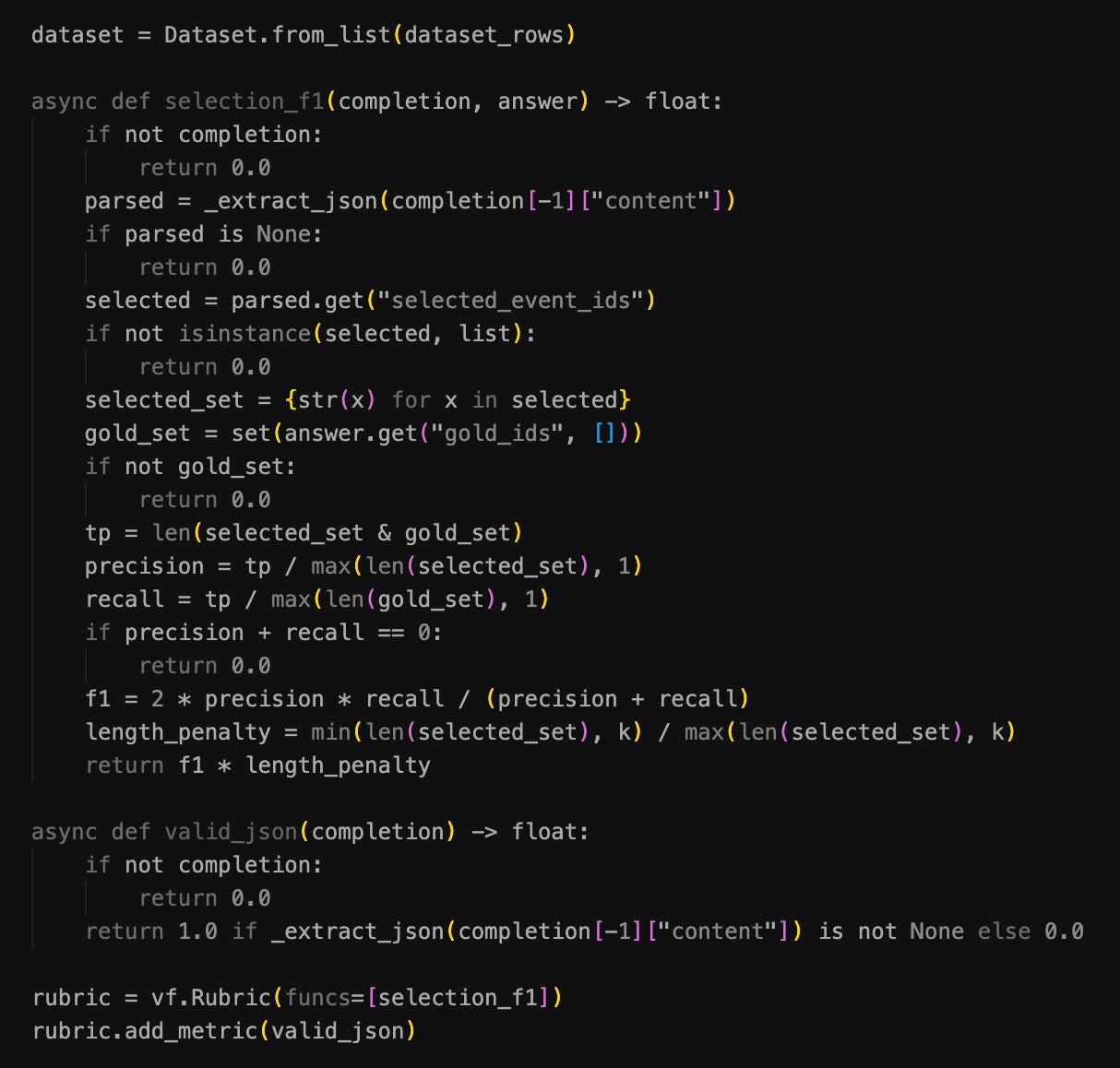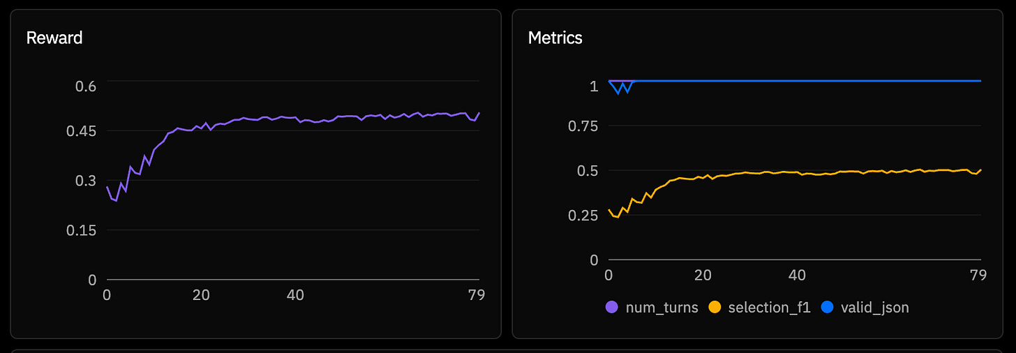 Understanding this, I ask Codex what is happening and it introduces me to the concept of F1 — a number (score) that is computed from the values (scores) of the precision & recall capabilities of a model. It is high when both are high. This is usually used in evals, but in my case, I use it as a reward signal because what I am training on (the exact json structure of my surveillance agent metrics) is specific enough to allow me to ask questions like: “how many metrics of the 8 i selected are correct” (precision) + “of all the correct events, how many did I select” (recall).