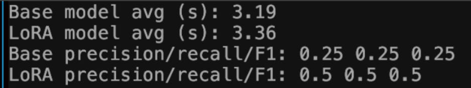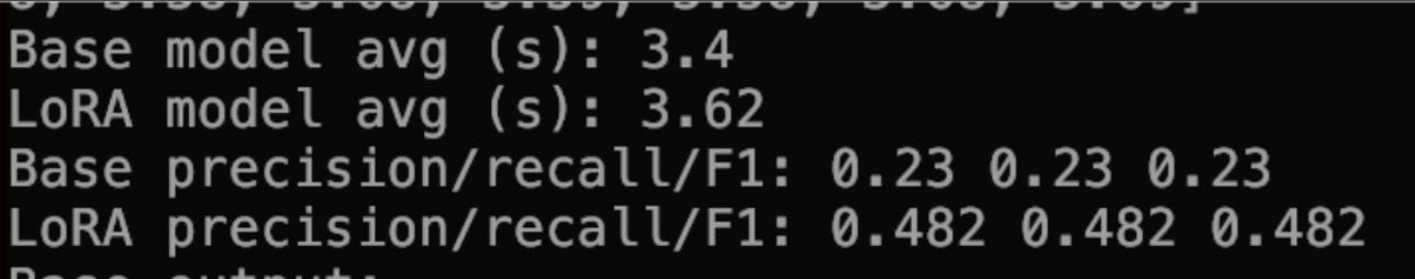 I create a basic evaluation script that would call both the base and the LoRA-patched endpoints with the same prompt and with the same records from the dataset. This shows the following result: