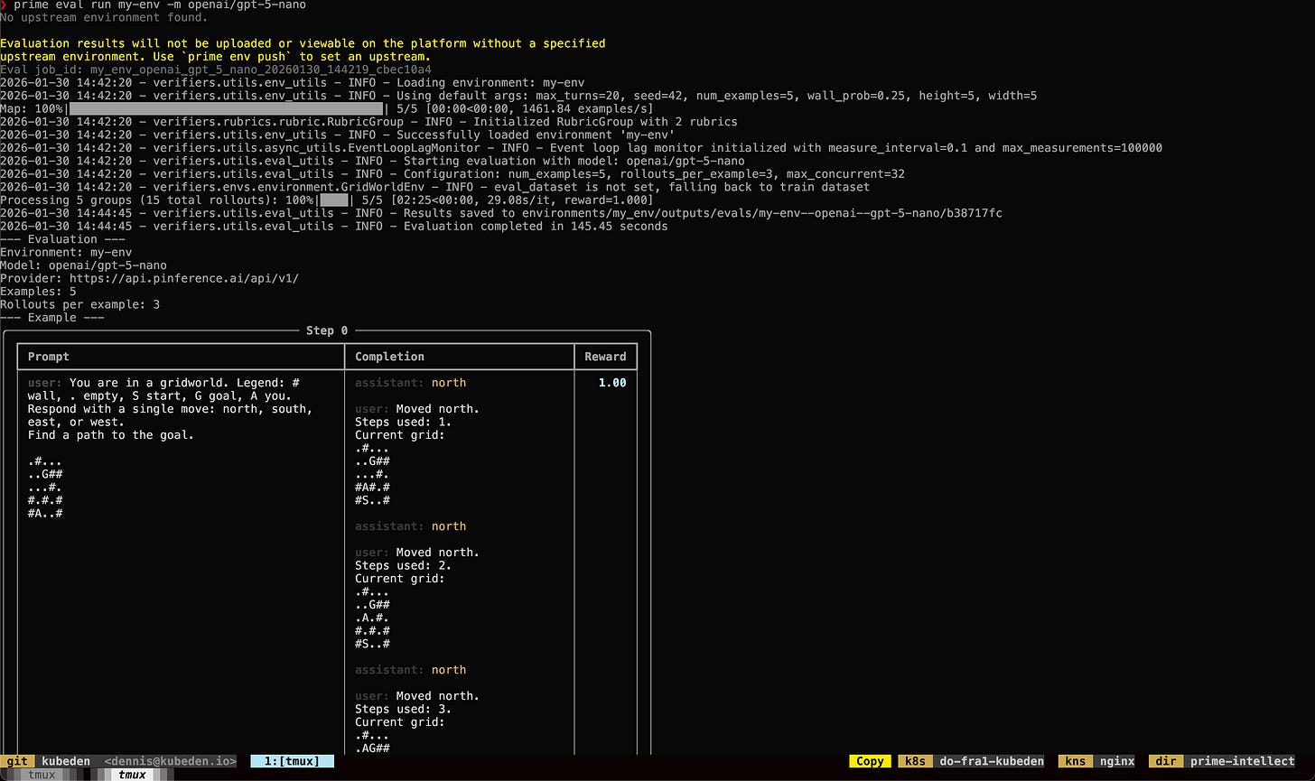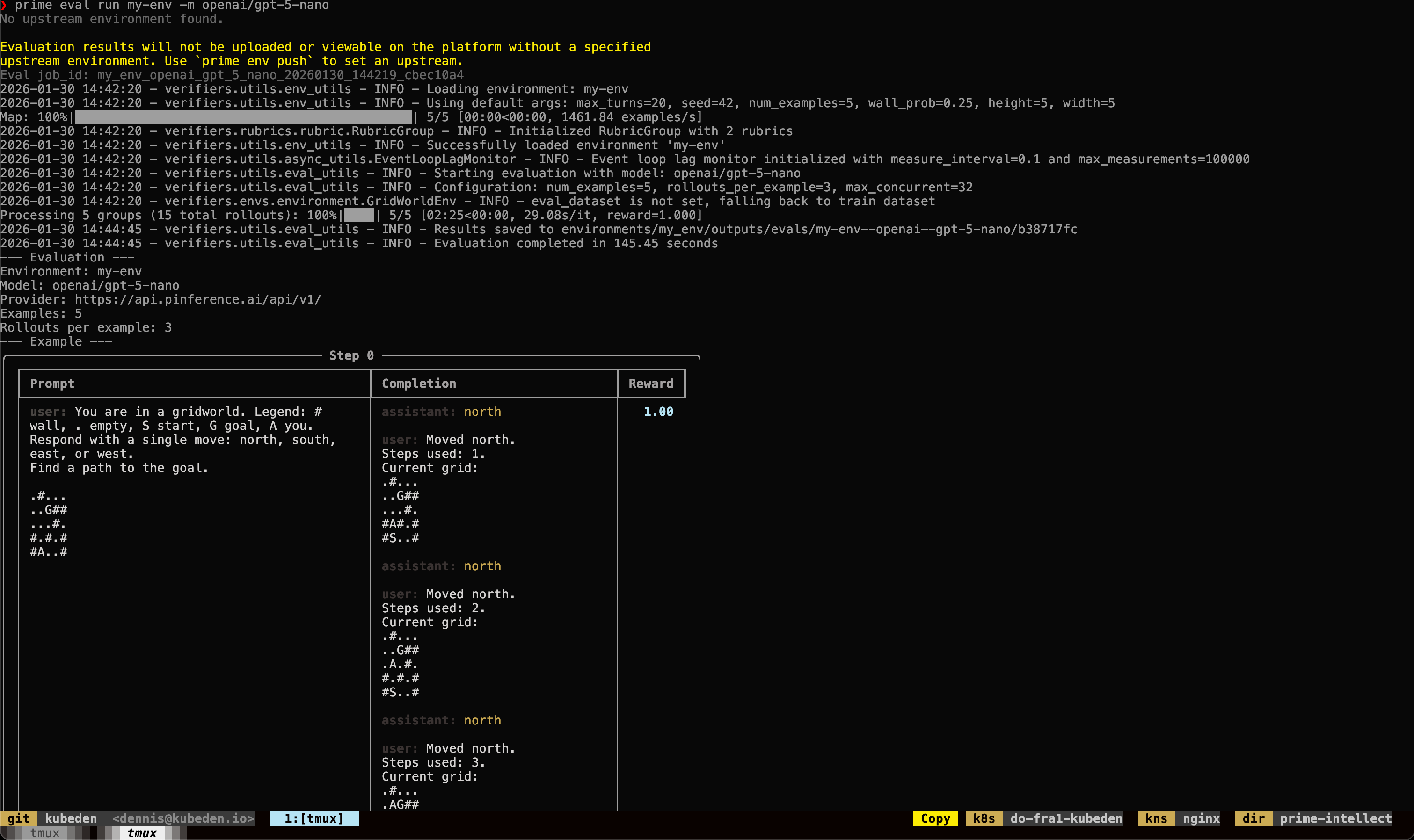 The first thing I do after reading through PI’s docs for their hosted RL feature was to install the prime cli and initialize my first local PI lab. I then initialize the starter evals environment. I explore the repository and notice there is no rubric configured. I didn’t know what a rubric is at the time, so after a short conversational back-and-forth with Codex, I acquire the following understanding: