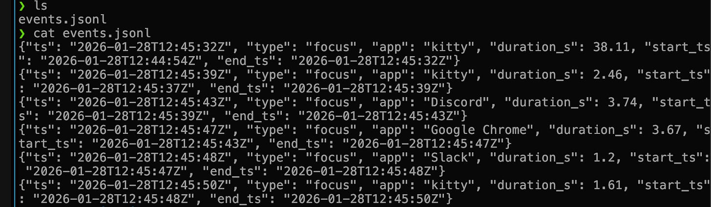 I start with the non-ml part. Particularly, with the data collection. For that I decide on a json structure (the “shape” of what I am going to collect), as well as the way I’ll collect it — through a background service. I generate some code and after 15 minutes of iteration I have what I want. Here is a screenshot of the data collection log: