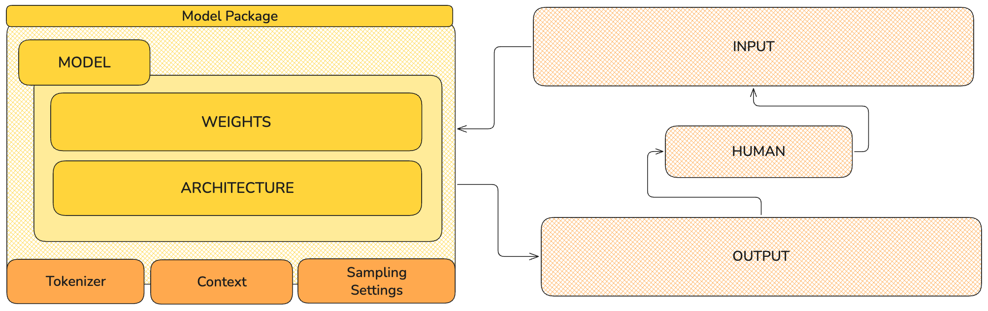say i am a very conservative human male that speaks english (when my brain hears english speech, it enables my “tokenizer”) and i’ve had a rough day at work (working context). my kid wants to go out after 9pm. “just yesterday i deliberately told it it will not go out after 9pm this week”, i think (working context), so naturally here is what happens: the model (earth and its physical limitations) exist; in that model, i exist. me being me, i have an understanding of the world by my own morals (weights), and my kid comes to me and says “i want to go out!” (input) which then triggers a process in me (i am being inferenced): i look at it, i see its face, i get a contextual understanding of the situation and its request, remember what we spoke about yesteday (current context/state) which then triggers a “subconscious reaction” in my “brain” (weights) [that basically merges my current context + my subconscious understanding of the world i.e. weights] and i decide to shout out loud (because of my sampling settings) [instead of calmly denying.. which i would’ve denied the request in either way (weights)], “HOW MANY TIMES DO I HAVE TO SAY YOU CANNOT GO OUT AFTETR 9PM” (output)