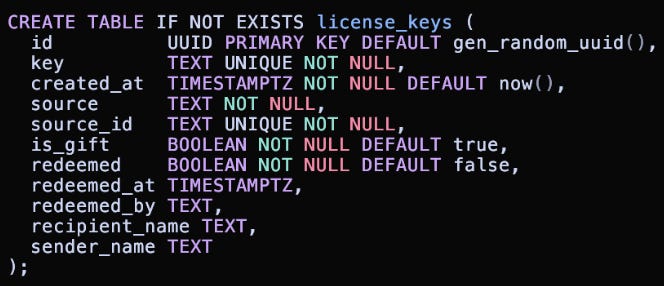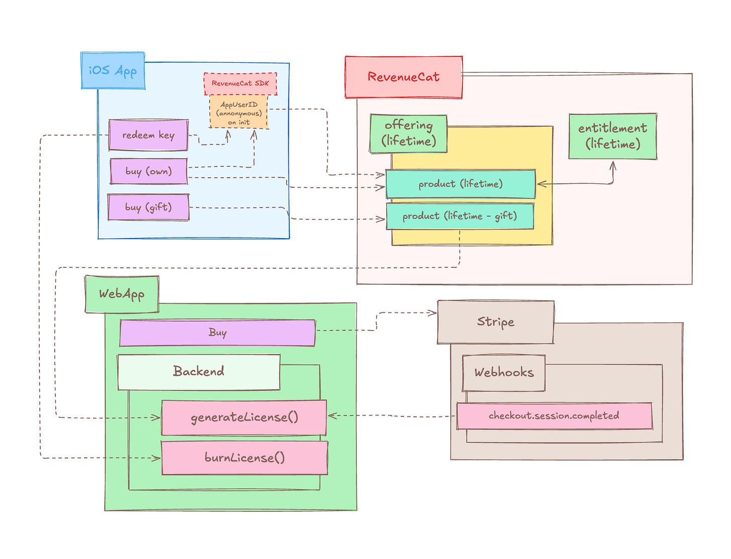 The bridge uses a combination of what I previously explained in the Stripe & RevenueCat sections. In my app, there is a button “Have a license key?” on the paywall, which when clicked, reveals an input box where the user can input their license (gift) key. When they do, the following happens: