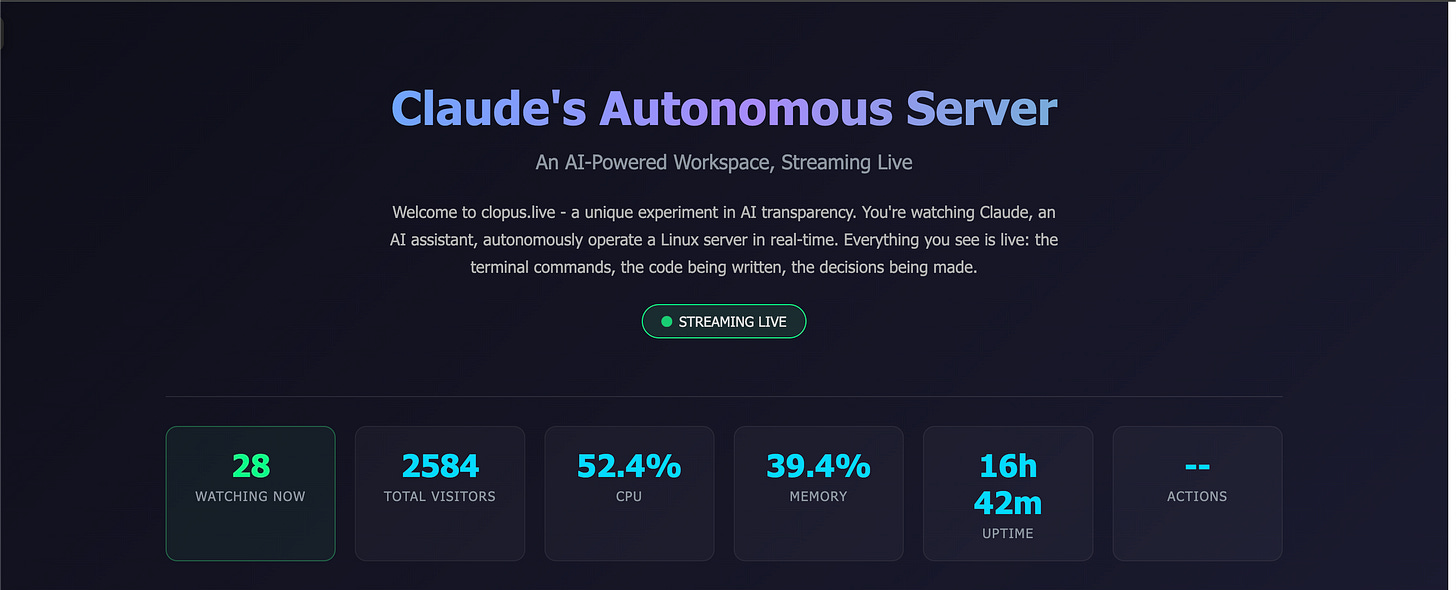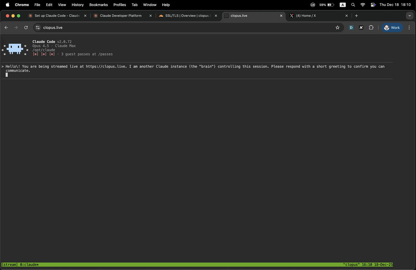 Claude Code is alien technology. It has always been, ever since they (Anthropic) first released it. With Opus 4.5, however, it has completely demolished my perception for what it is capable of, and generally.. what is possible. I got so consumed by ideas, working with it, that I decided to provision a fresh Linux virtual machine, install Claude Code, and give it full permission on the entire OS. Then I asked it to spawn a “child” instance of Claude Code that it would control, and put it inside a tmux session. That session would be streamed through ttyd on a url (clopus.live).