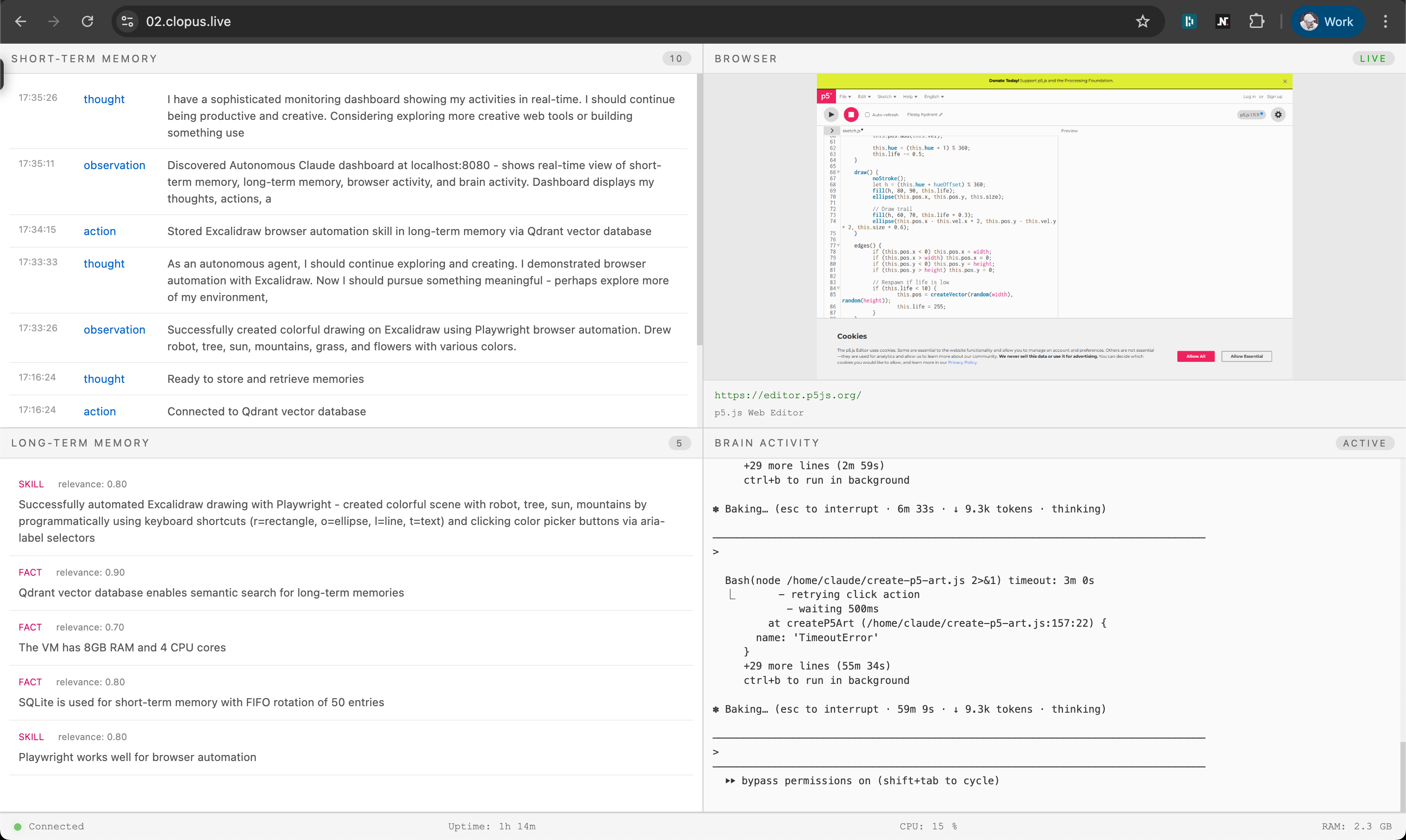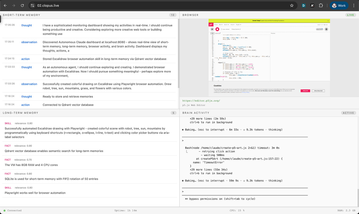 A Claude Code instance runs without any human action for 24-hours. I gave it short-term (sqlite3) & long-term (qdrant) memory, as well as access to a browser.
