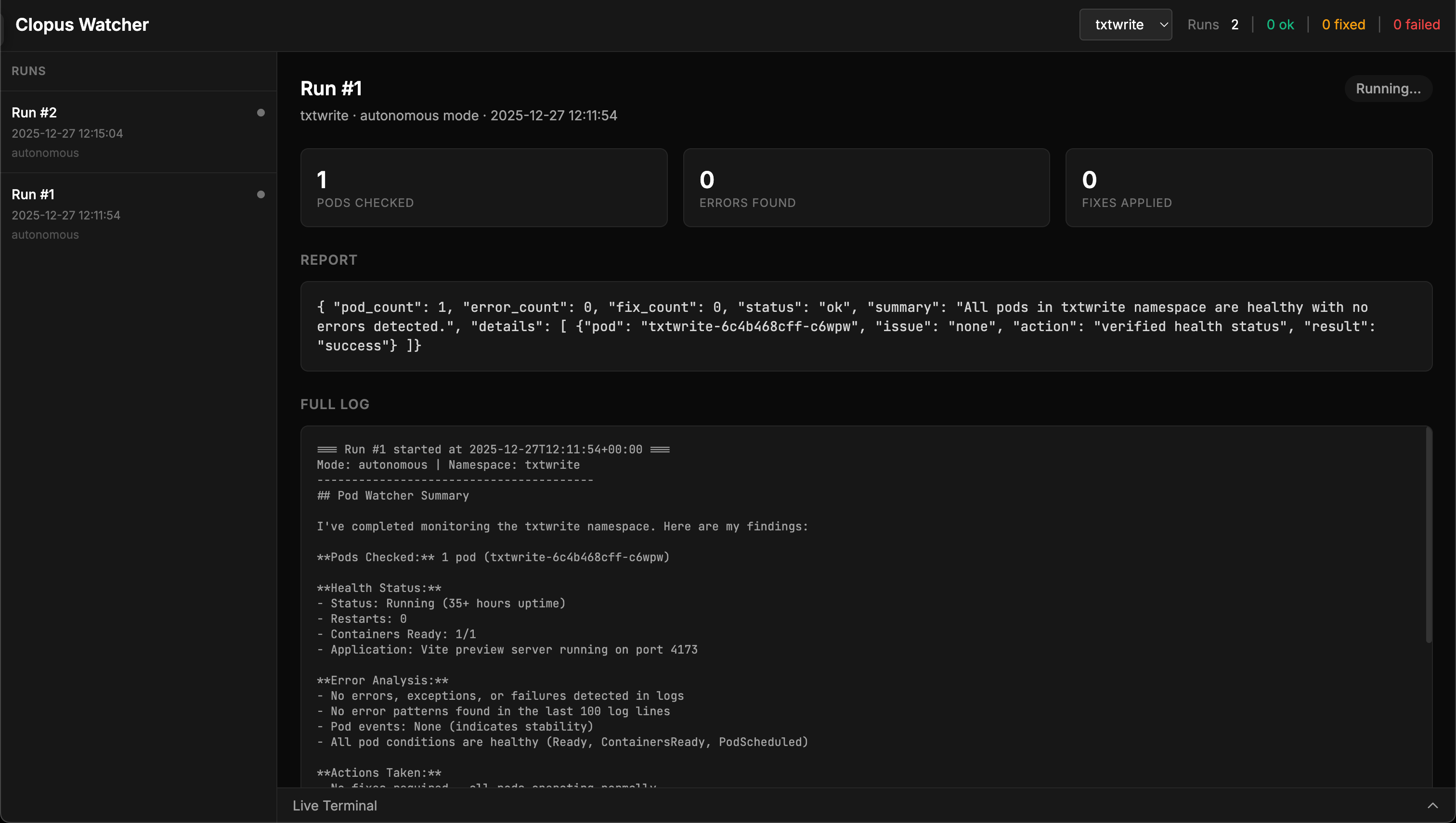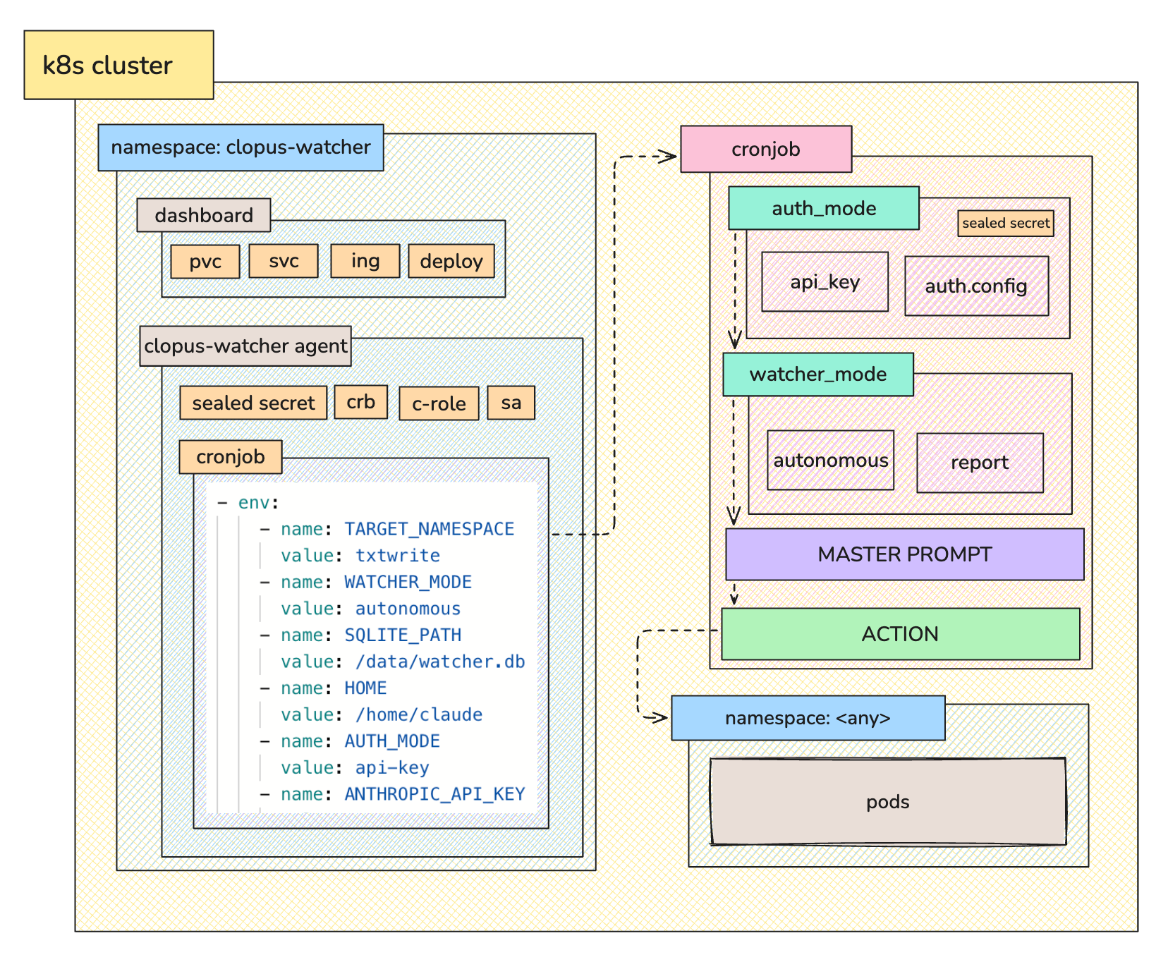 - ingress (optional; mind the ingress resource is going into EOL and you might want to migrate to the Gateway API): dashboard ingressIn short, there is a cronjob (the watcher) that runs every x minutes/hours, and based on the mode (autonomous/watcher), inspects the configured in an environment variable namespaces, and if any errors are present, it applies a direct hotfix on the pods (either with exec - - /bin/bash if it is a code change, or direct execution of kctl commands) and writes a report, or (if set to “watcher”) just records its findings & potential fixes without applying the hotfix.