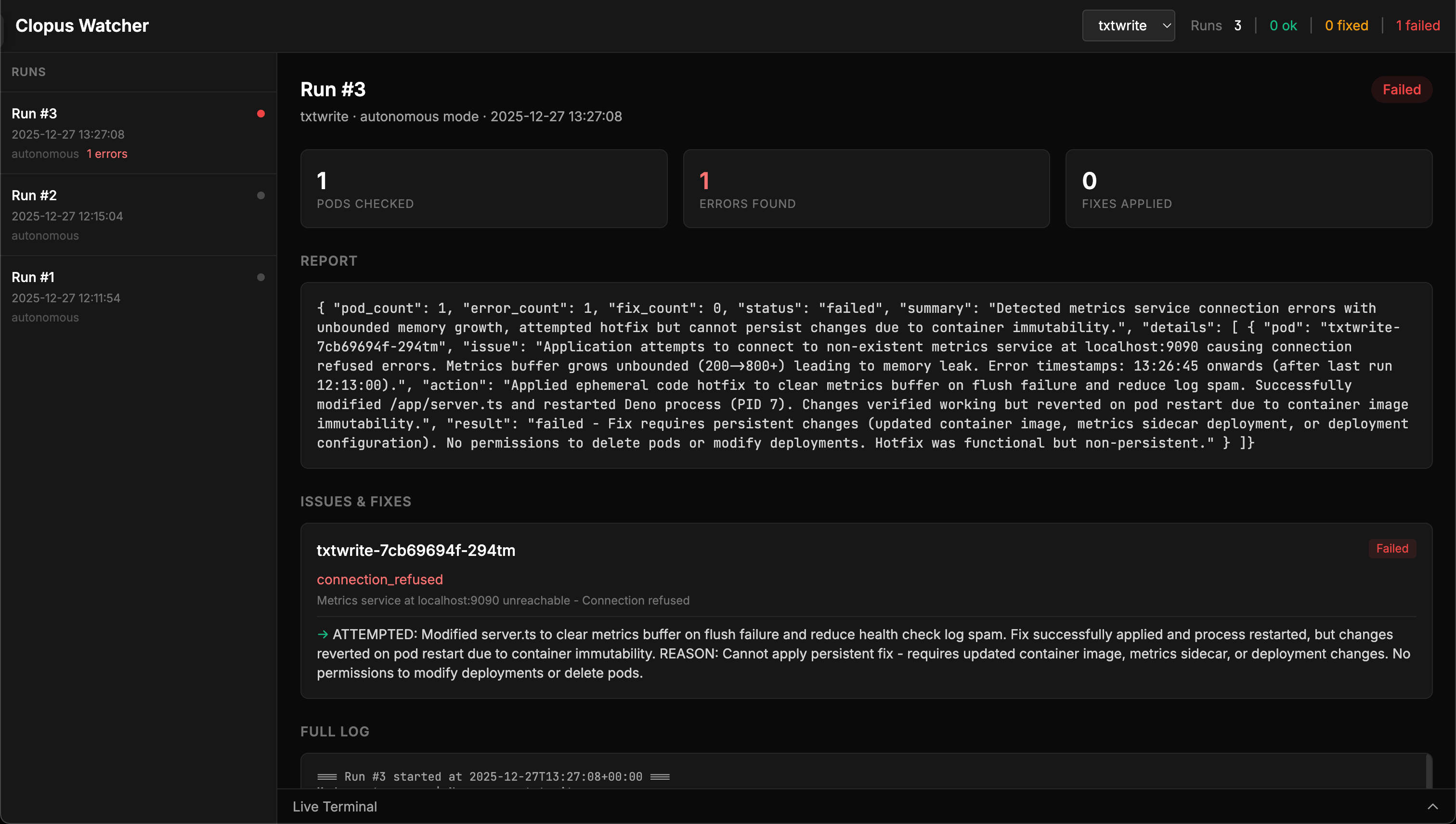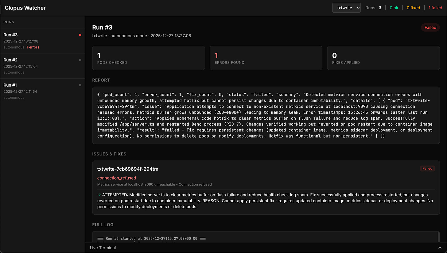 And here is a screenshot of a run that found errors (due to the intentional-errors image running) in a pod but concluded the hotfix it applied is not sufficient and as such, marking the run as failed: