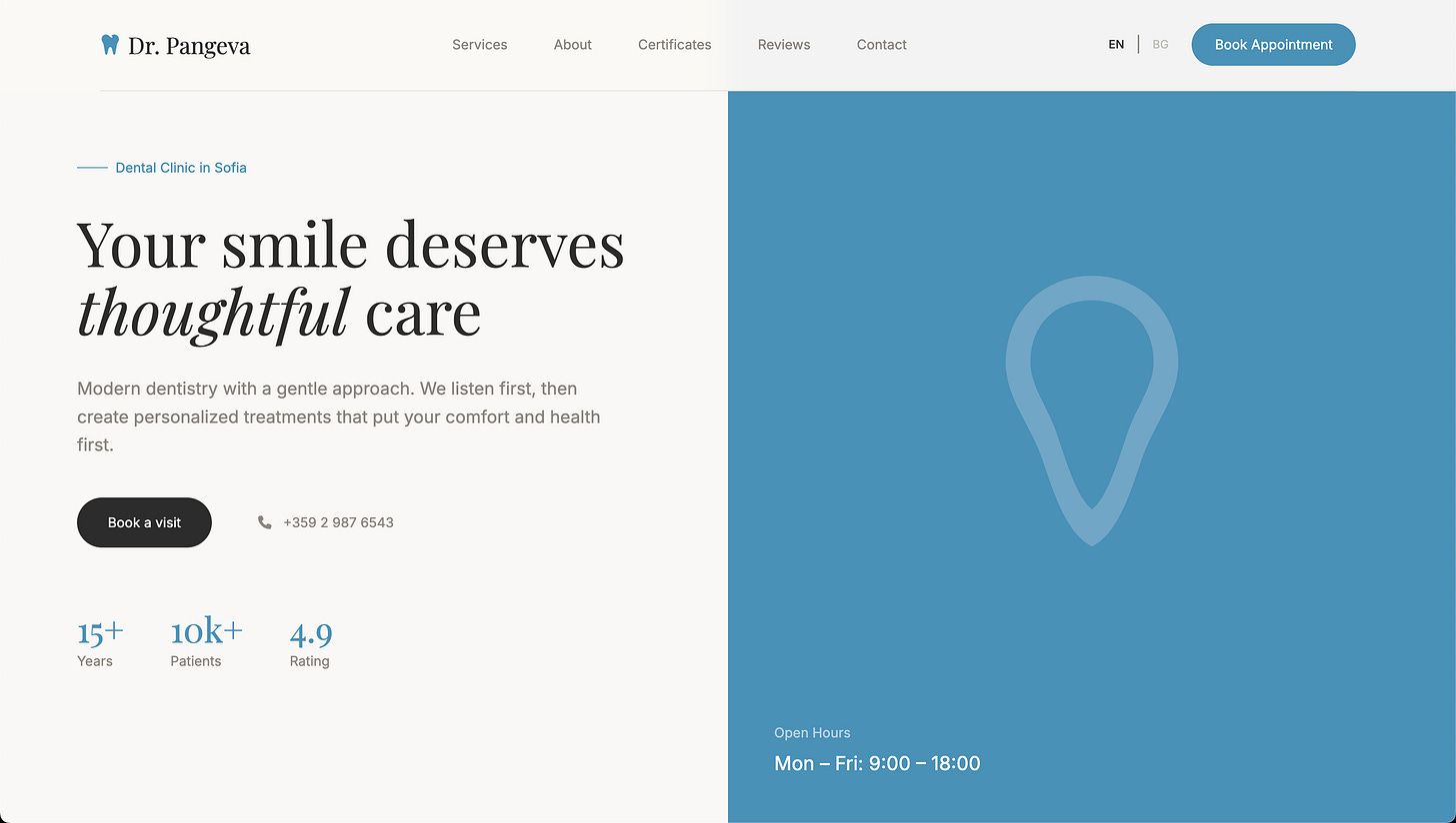 I opened my local Claude Code, and asked it to do research on the top dental studio websites, then do a web search for my girlfriend’s sister’s studio, get her contact information, the google maps embed link, a tailwindcdn src link, and a font-awesome src link. I then asked it to create a beautiful landing page, and it did:
