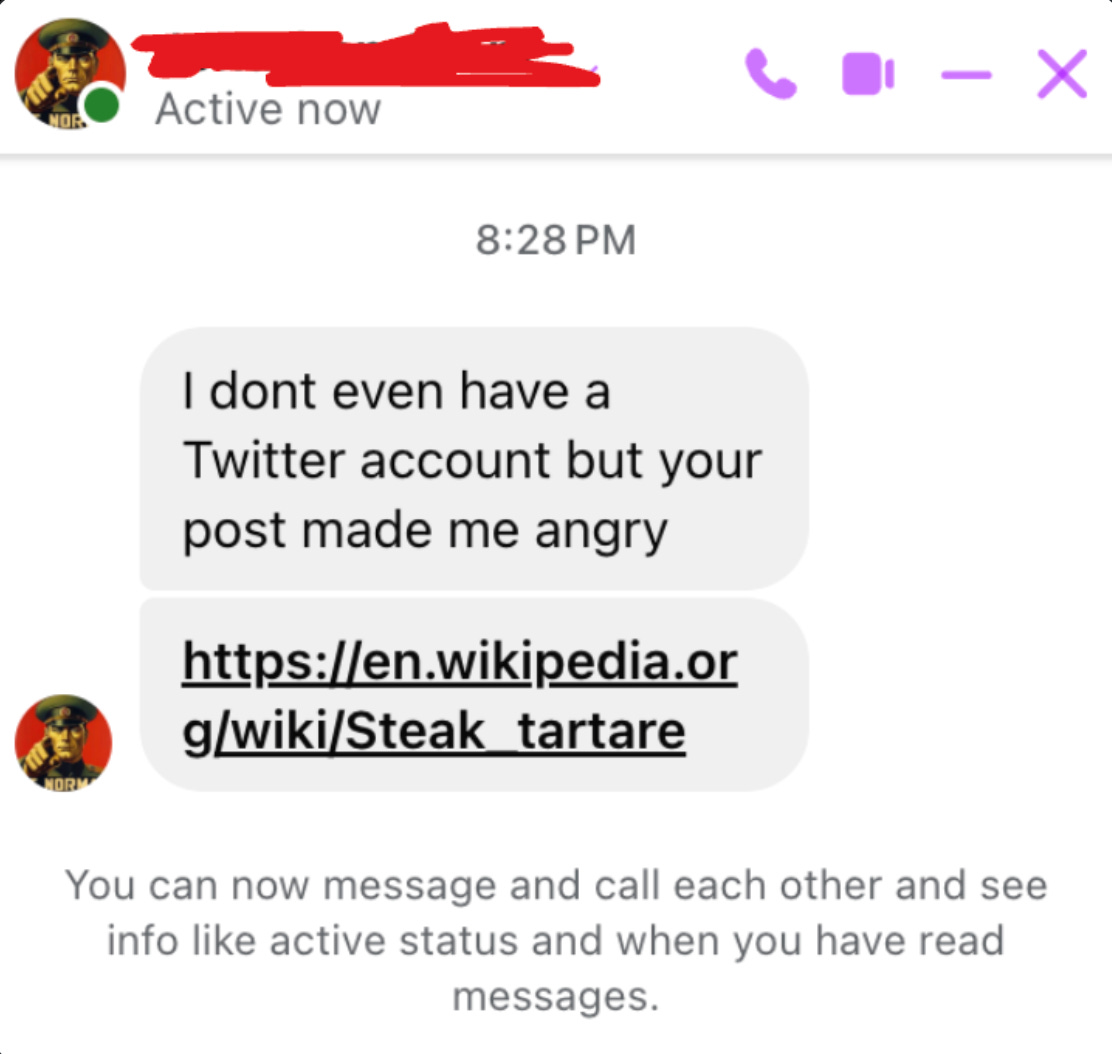 The first 5 replies under a post make for the entire direction the public is about to take when they decide to engage, too. In my case, the first 5 replies were ones ironically ridiculing me, in a friendly manner, that ordering steak tartare and cooking it is a hilarious direction.