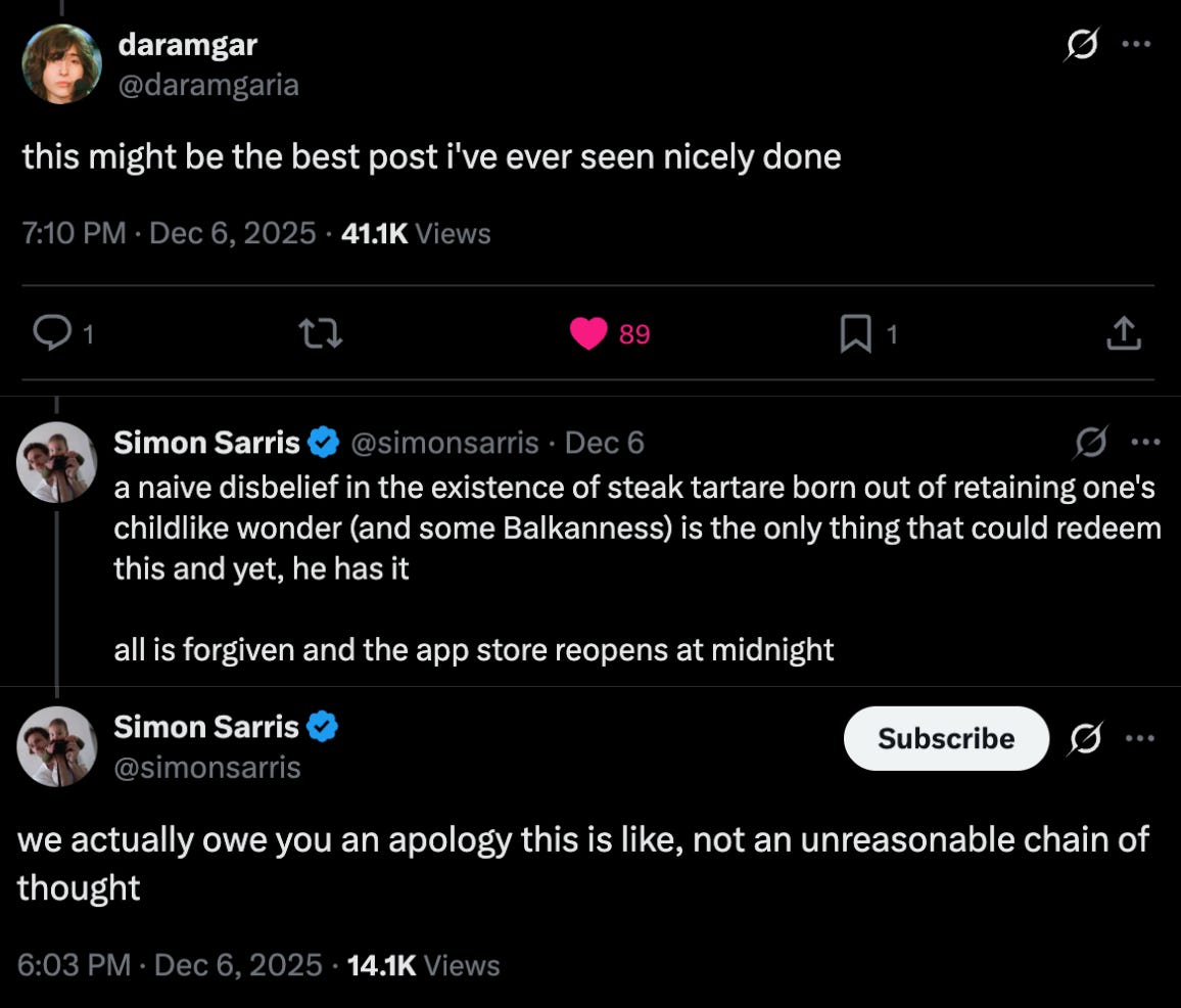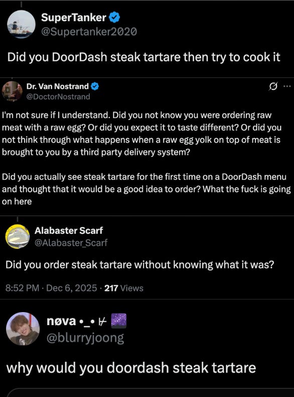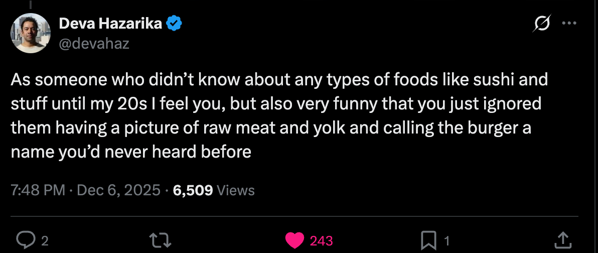 Twenty-four hours after I posted my Tartare — raw AND cooked — the post banged. Five million impressions, death threats, all the stuff that come with a banger. Good laughs, too.