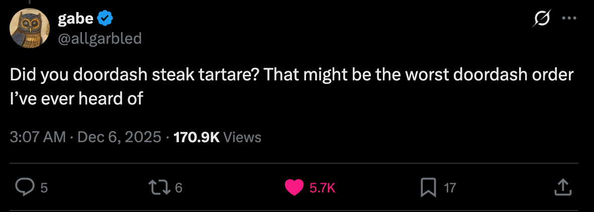 This user (@allgarbled) hinted at how funny ordering a steak Tartare is: